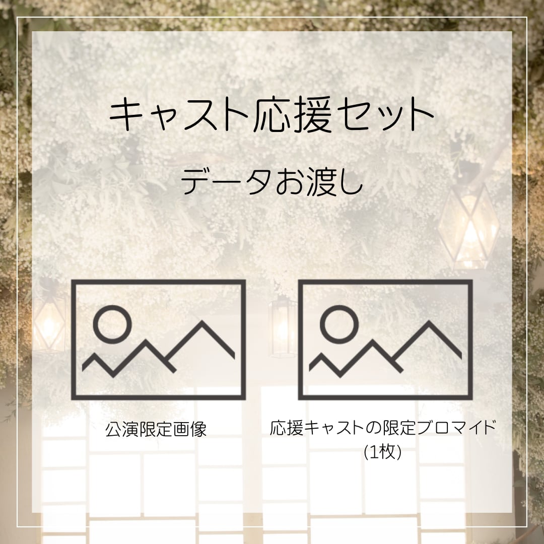 ・公演限定ポストカード ・応援キャスト限定ブロマイド(1枚) ※お選び頂いたキャストのブロマイドとなります。 【データお渡し】 6月より、ご登録いただいたメールアドレスへ順次お送りいたします。